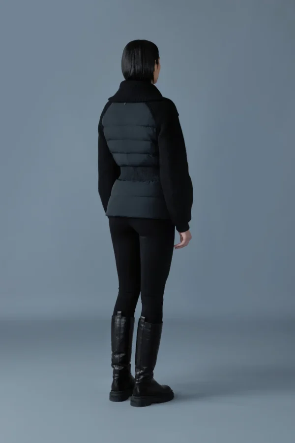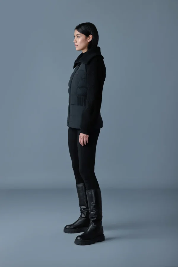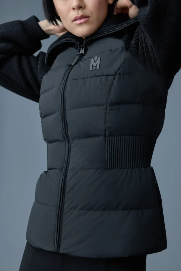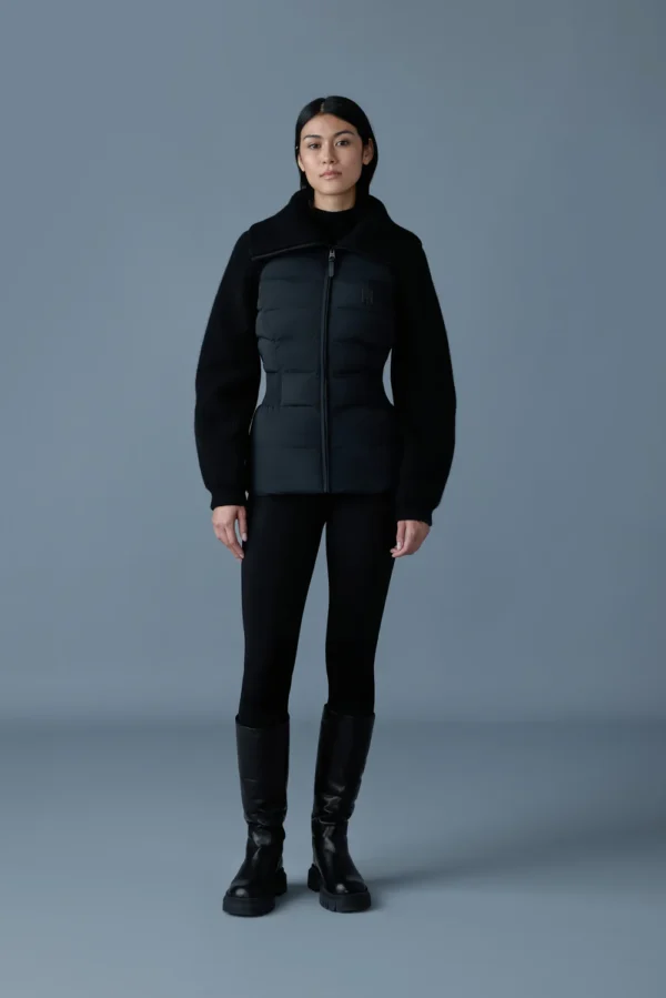 Le manteau de confection hybride FOXY présente un panneau avant et un panneau arrière en duvet léger recyclé. De fabrication soignée, ce modèle intérieur-extérieur est doté de manches et d’un col en tricot. Des fronces élastiquées à la taille créent une silhouette cintrée, alors que les manches ballons isolées ajoutent chaleur et style moderne.