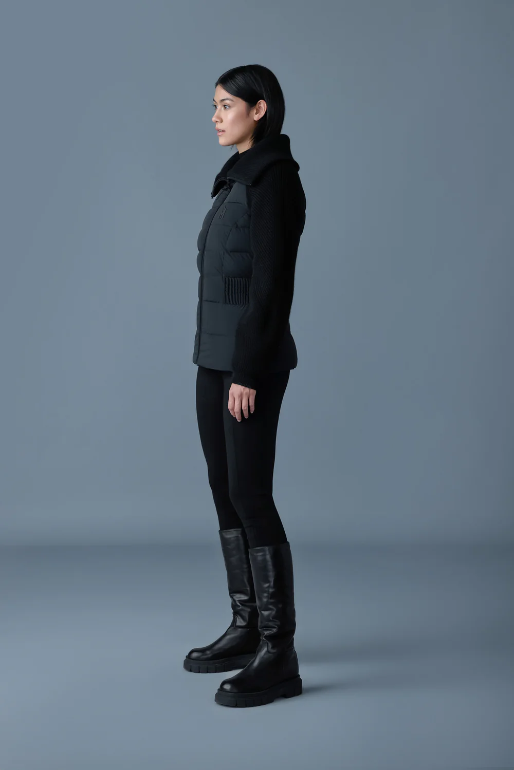 Extérieur: 82% nylon recyclé, 18% élasthane/spandex. Combo extérieur: 100% laine. Doublure: 82% nylon recyclé, 18% élasthane/spandex. Doublure: 90% duvet de canard, 10% plumes. Hydrofuge et résistant à l’eau.