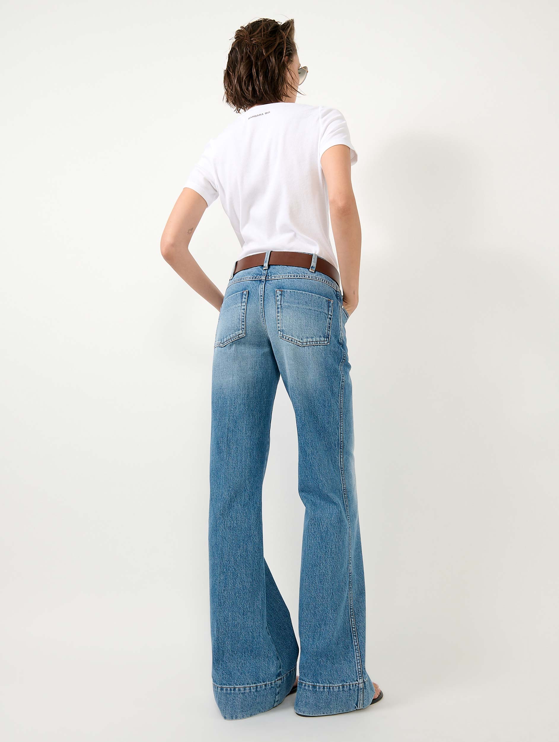 Instantanément cool, le jean flare inspire à une tenue une note seventies à la fois chic et décontractée. Pour souligner l’élégance de ce jean femme au délavage parfait, un pli cousu parcourt sa jambe dramatiquement évasée. Porté avec un simple tee-shirt en coton blanc, une ceinture en cuir et des sandales à talons ce pantalon en denim vous accompagne dans votre quotidien tout en flattant votre silhouette. Ses finitions soignées, inspirées des signatures traditionnelles typiques du denim, sont toutes retravaillées avec l’élégance qui caractérise le vestiaire de la Maison, du tab siglé BB en métal plaqué à l’or fin au jacron en cuir au logo Barbara Bui maintenu par des rivets en métal argenté.