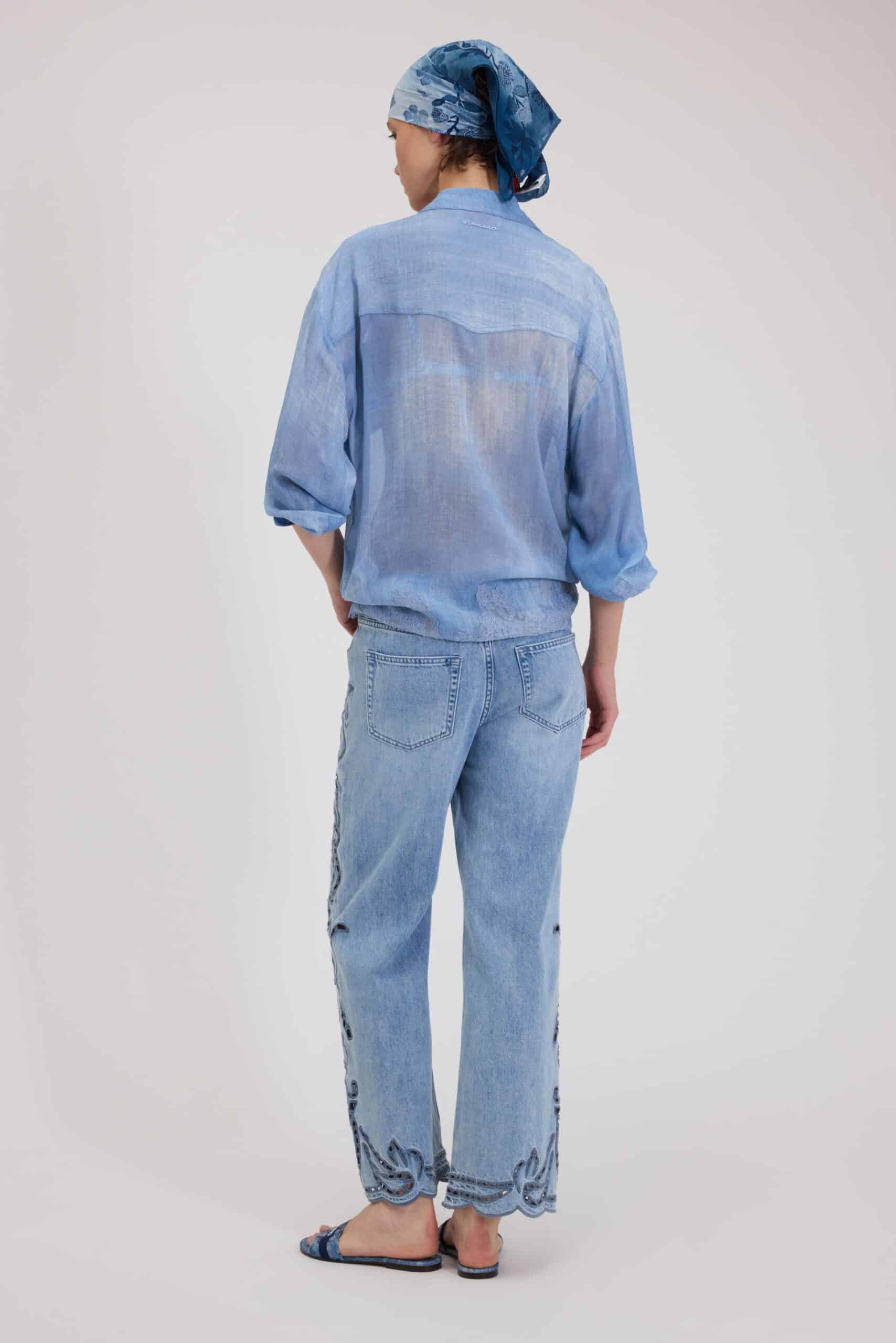 Jean court à cheville en denim clair avec broderie florale ajourée et ourlet ondulé