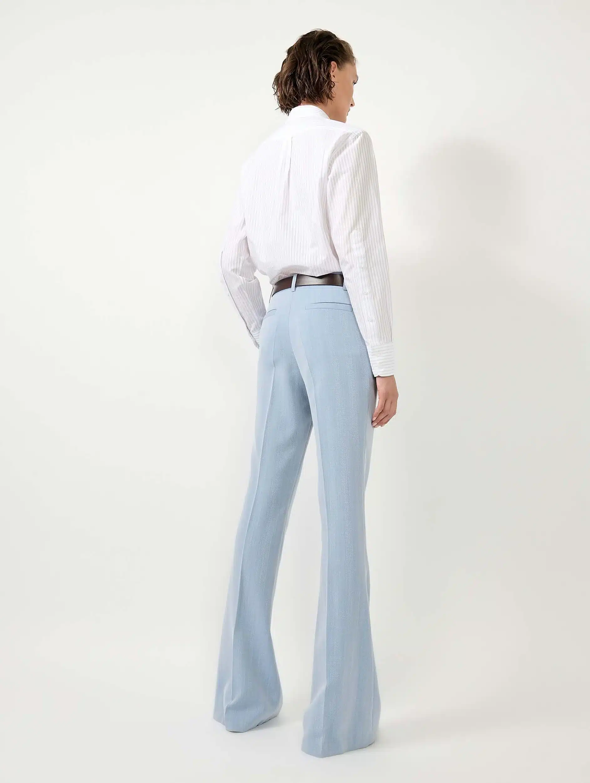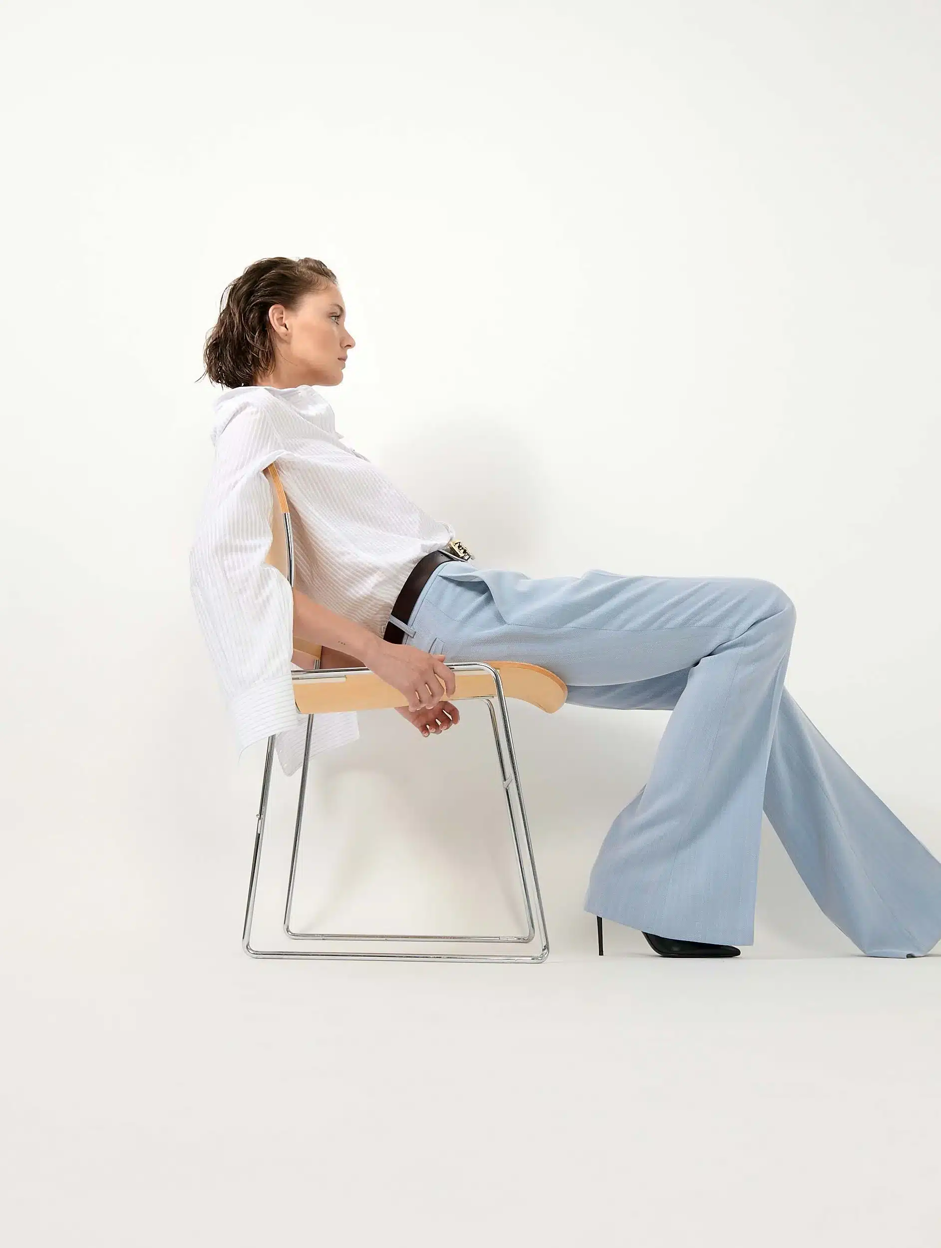 Taillé dans un crêpe bleu ciel au motif chevrons, ce pantalon assure une allure sartoriale et féminine à tous vos évènements et vos cérémonies de la saison. Sa coupe bootleg s’évasant élégamment sur la pointe d’une sandale à talons et son pli marqué parcourant la jambe accentuent l’allure de ce pantalon de costume aux lignes nettes, acérées. Porté avec la veste assortie ou simplement associé à une chemise rayée, ce pantalon tailleur deviendra l’un de vos plus précieux allié.