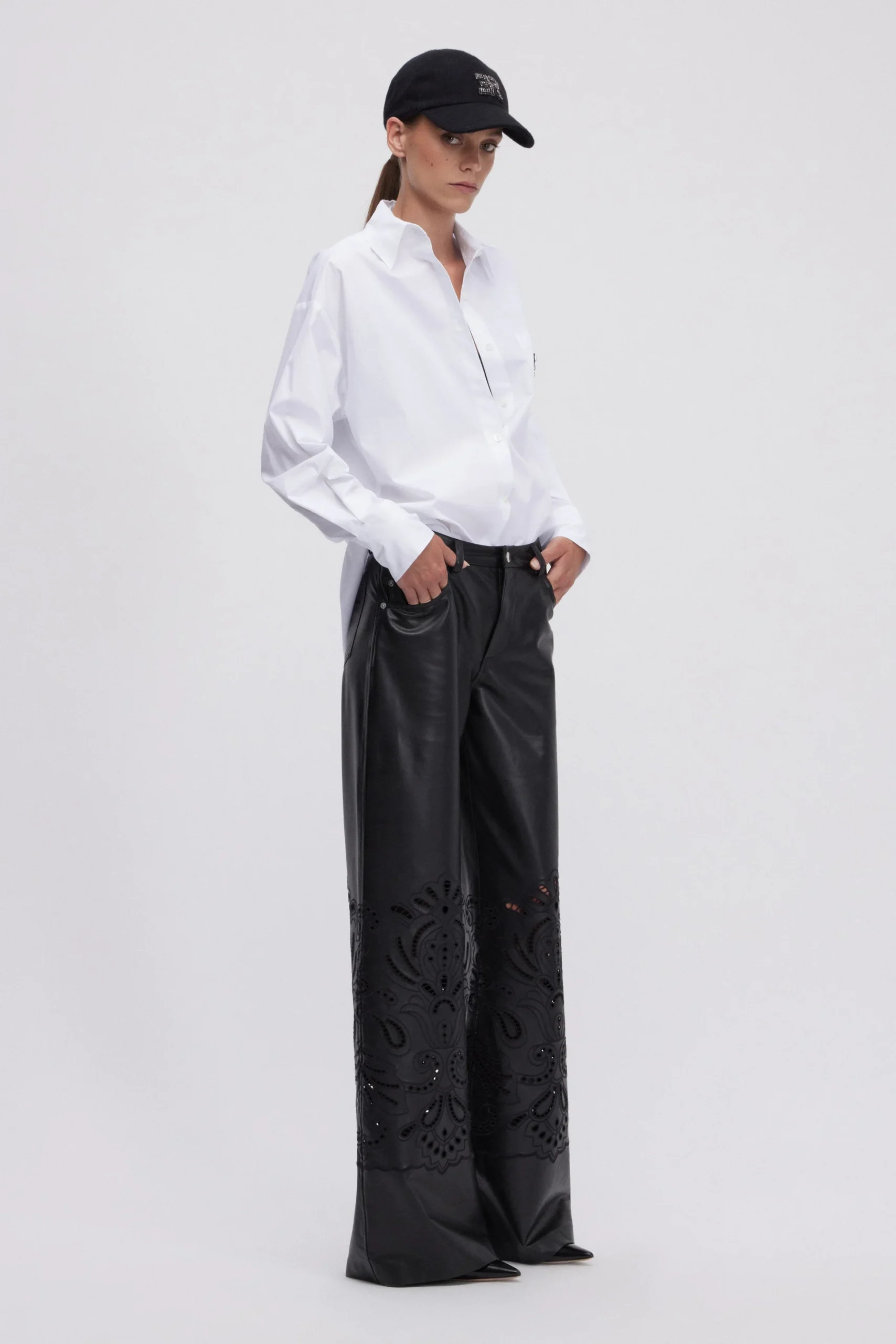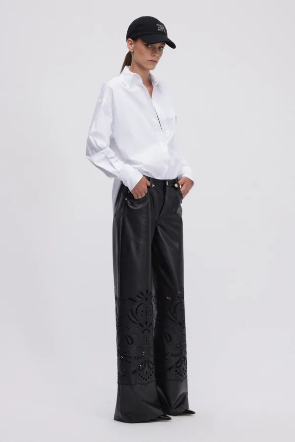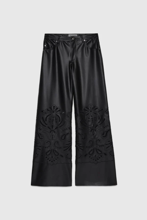 Pantalon évasé 5 poches en faux-cuir avec broderie anglaise assortie. Bouton et rivets en métal.