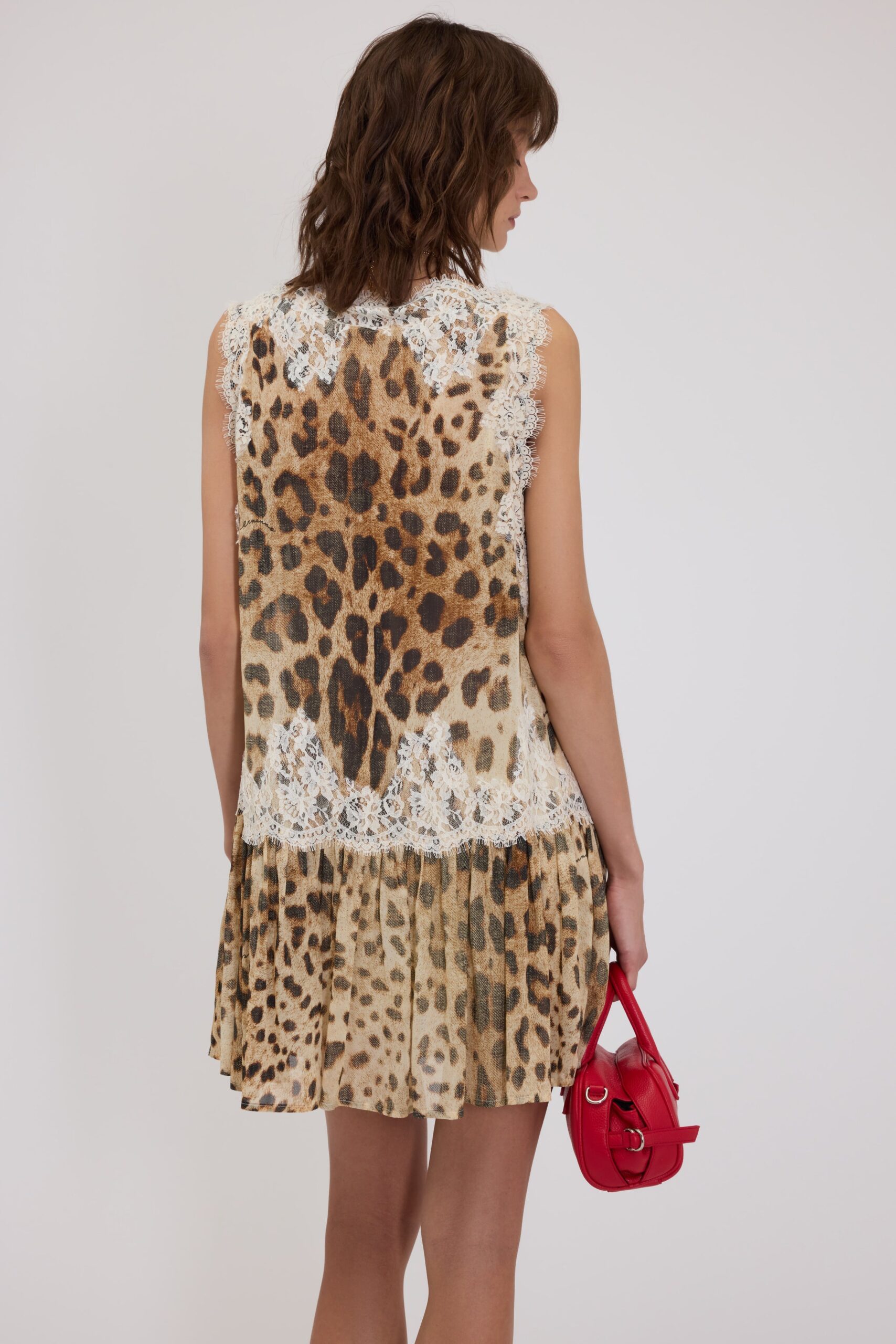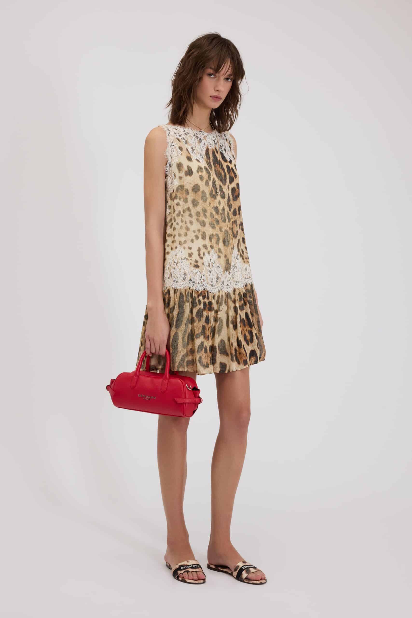 Robe imprimé léopard avec dentelle florale contrastante. Silhouette droite avec jupe froncée