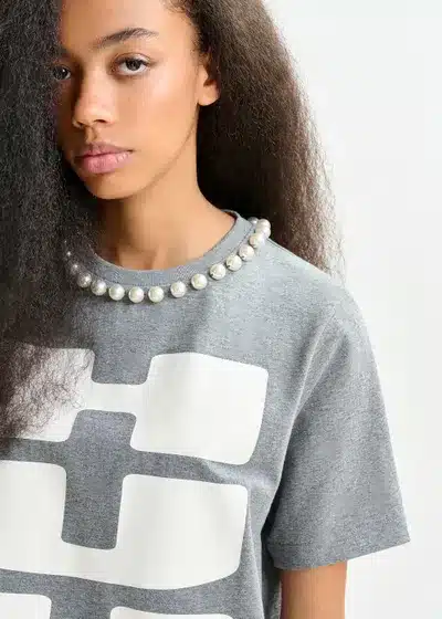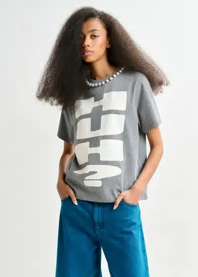 T-shirt en coton gris et blanc avec imprimé "HUH" avec perles