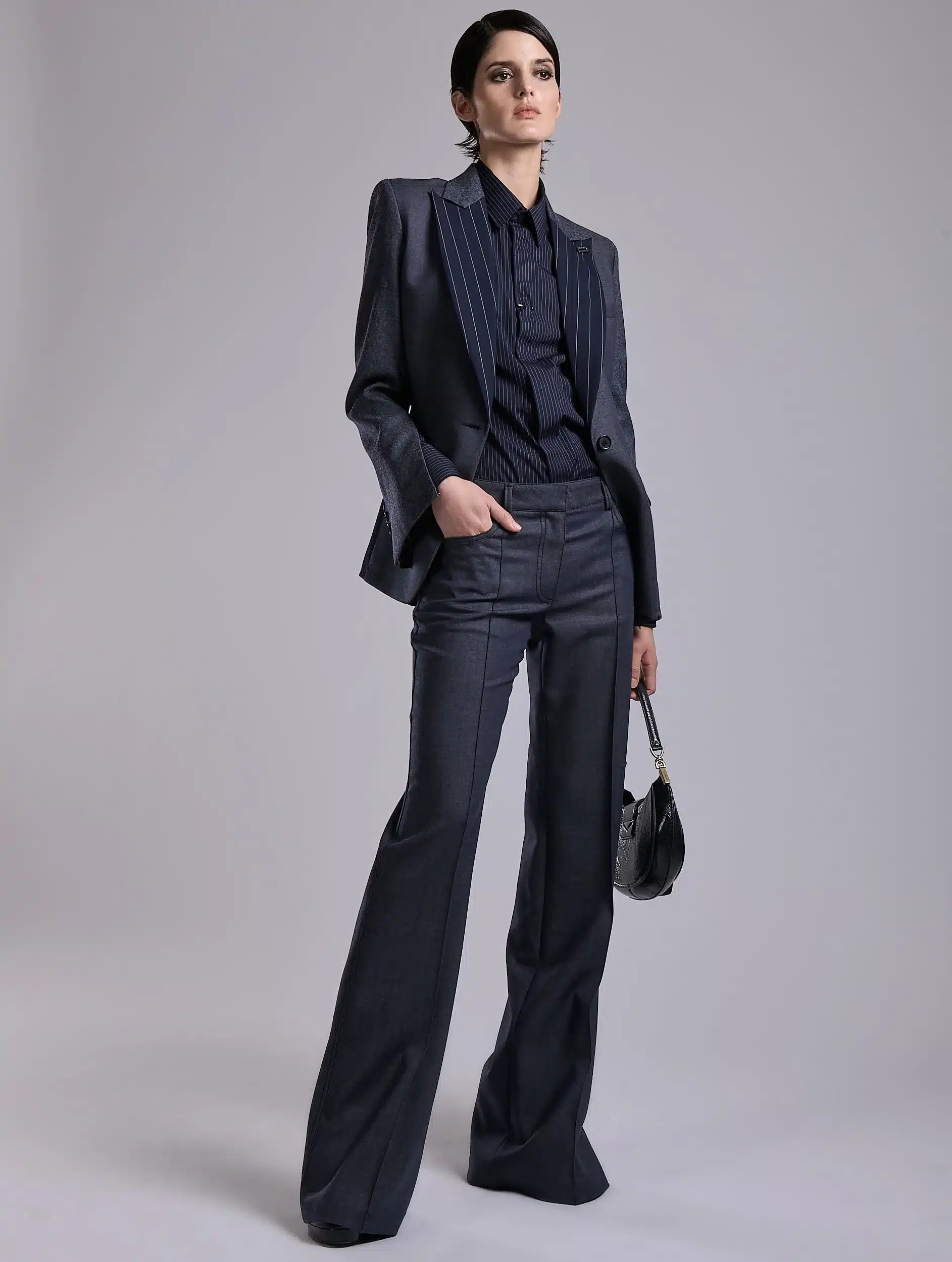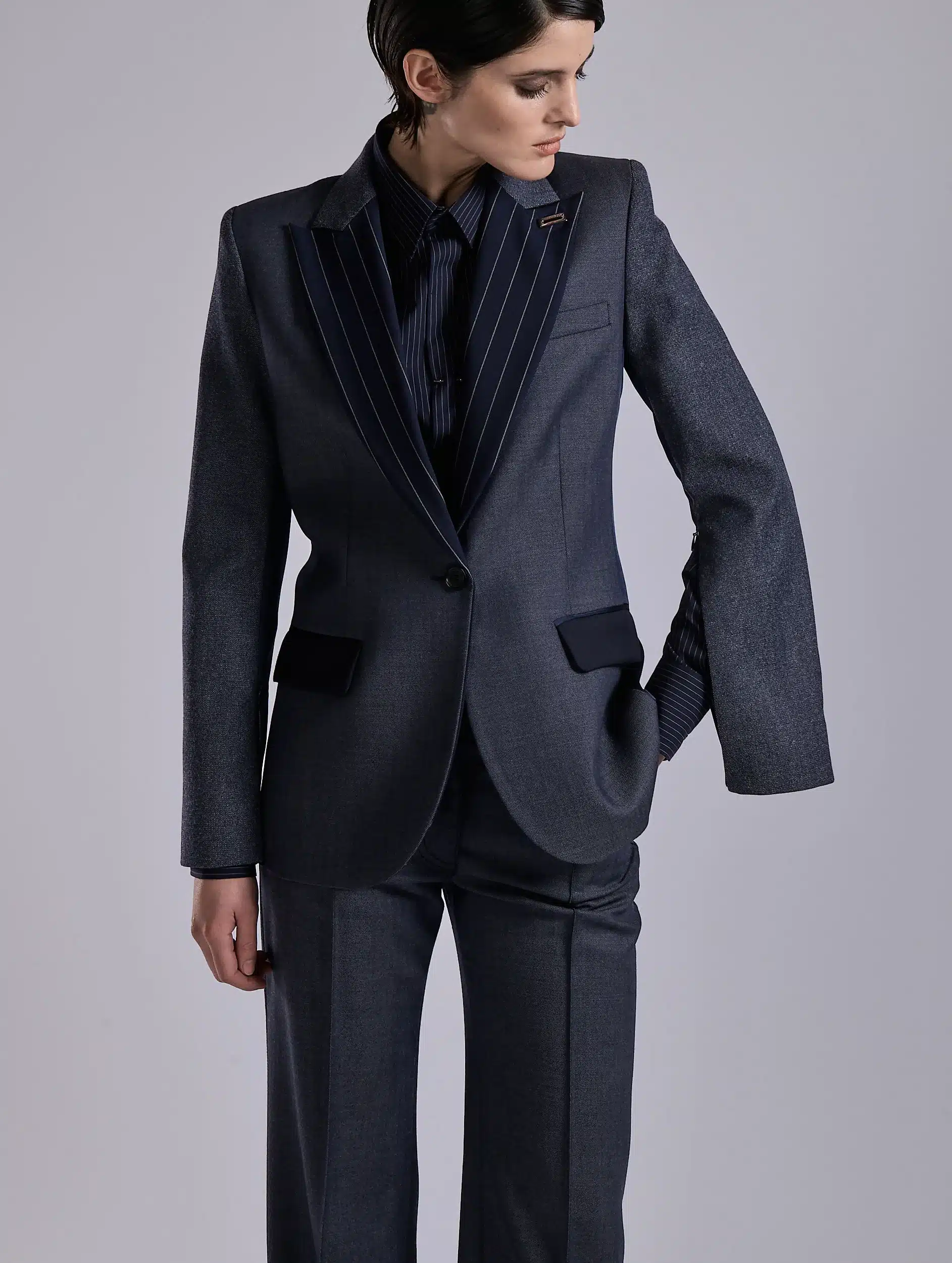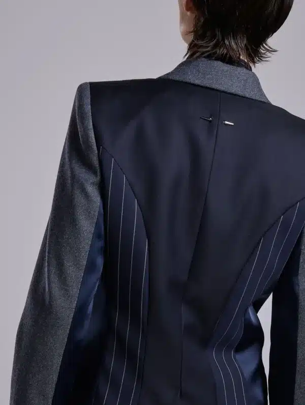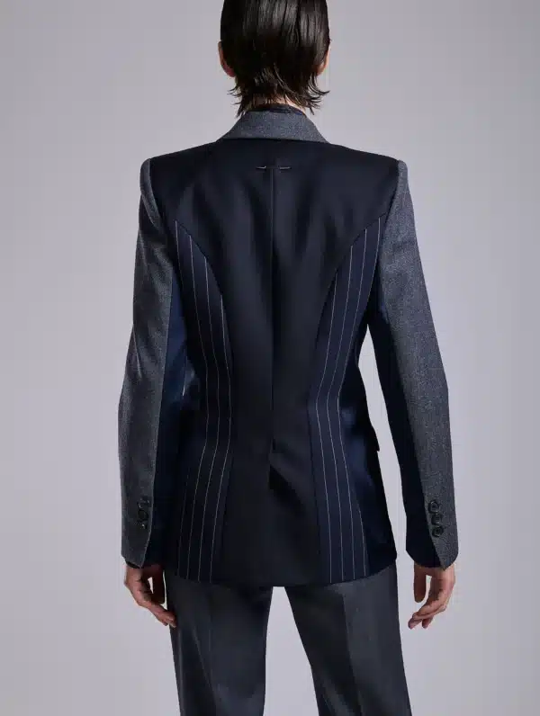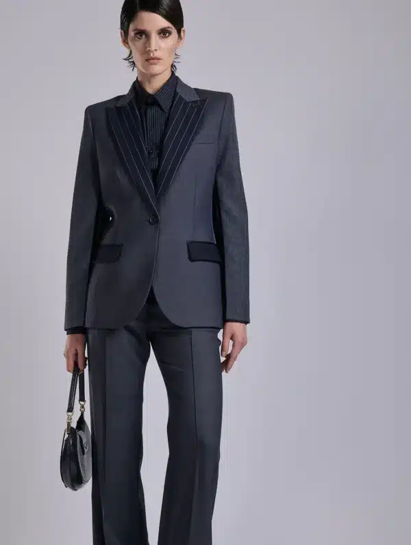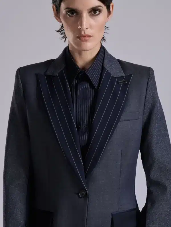 Avec cette veste, Barbara Bui imagine un modèle conçu comme un patchwork sartorial. Confectionnée dans une laine Super’s 100 à effet denim, cette veste à un bouton est agrémentée d’un col accentué à rayures italiennes. Un effet répliqué sur l’arrière et associé à une étoffe marine unie pour apporter une touche graphique subtile. Les manches de cette veste sont réalisées dans une autre toile pour un effet denim légèrement différent. Elles comportent un zip discret permettant de les porter ouvertes au gré de vos envies. Des poches à rabat passepoilées marine offrent un rappel subtil du col smoking. Pour jouer le total look, associez cette veste à une chemise rayée et à son pantalon flare.